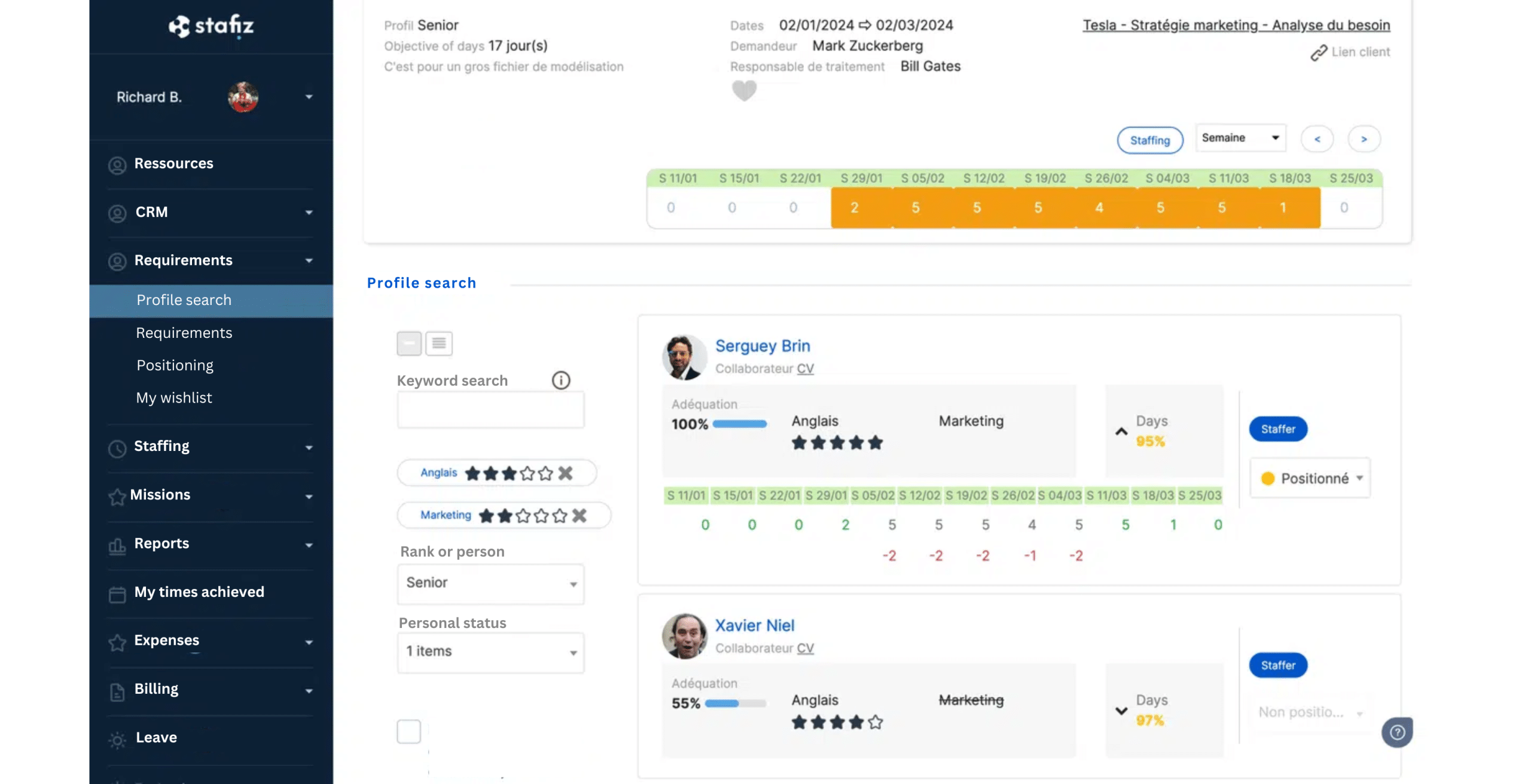 To overcome this problem, Stafiz offers employees the opportunity to indicate their appetite for a type of mission, sector or skill to be mobilized during a project on their profile.